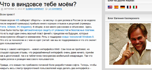 «Лаборатория Касперского» объявляет о готовности своих продуктов для домашних пользователей к выходу Windows 8: новые защитные решения Kaspersky Internet Security 2013 и Антивирус Касперского 2013 полностью совместимы с новой платформой. Компания Microsoft внесла много изменений в свою ОС, как по части интерфейса, так и в сфере безопасности. «Лаборатория Касперского» обеспечила поддержку нового пользовательского интерфейса ОС, ориентированного на планшетные компьютеры и сенсорные экраны, а также ряда новых функций безопасности в Windows 8.... Приложения, созданные в расчете на новый интерфейс Windows 8, имеют ряд уникальных характеристик безопасности по сравнению с традиционными программными продуктами. Каждому приложению присваивается один из четырёх статусов – нормальная работа, недействительная лицензия, программа видоизменена или претерпела несанкционированное вмешательство." и так далее, с отимизмом.