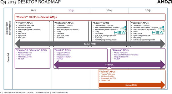 В 2014-м для настольных компьютеров AMD предложит гибридные процессоры нового поколения Kaveri, выпускаемые по 28-нм техпроцессу. Они получат до четырёх вычислительных ядер с микроархитектурой Steamroller и графическое ядро семейства Volcanic Islands, содержащее до 512 потоковых процессоров. Эти APU предложат поддержку технологии HUMA (Heterogeneous Unified Memory Architecture), позволяющей вычислительным и графическому ядрам иметь полный доступ ко всей системной памяти.