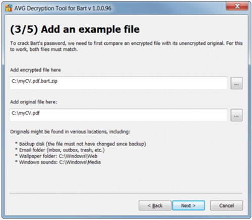 После запуска декриптор AVG запрашивает пару файлов для анализа. Кроме того, нужно показать ему, где лежат остальные документы, испорченные трояном-вымогателем. Об остальном программа позаботится сама.