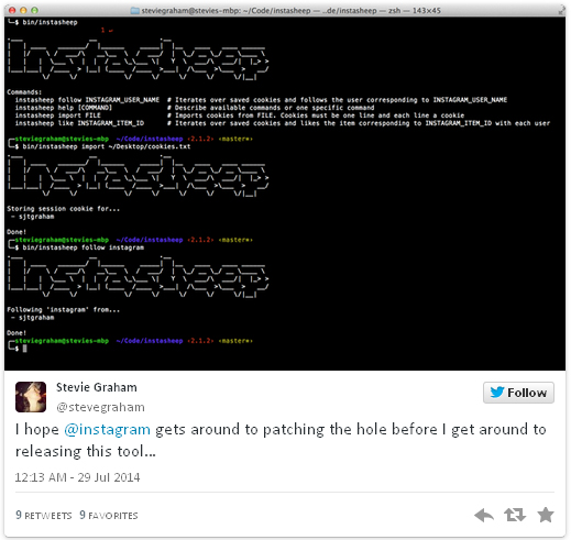 Возмущённый таким поворотом событий и тем, что специалисты сервисов за долгие годы так и не смогли исправить столь серьёзный баг, Стиви Грэм пообещал выложить в сеть созданную им специальную программу Instasheep, позволявшую использовать уязвимость для взлома аккаунтов.