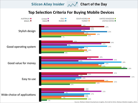 Аналитики компании Nielsen выяснили в своем недавнем исследовании, чем руководствуются потребители при выборе своего нового телефона. Как оказалось, жители разных стран подбирают мобильники по разным критериям.