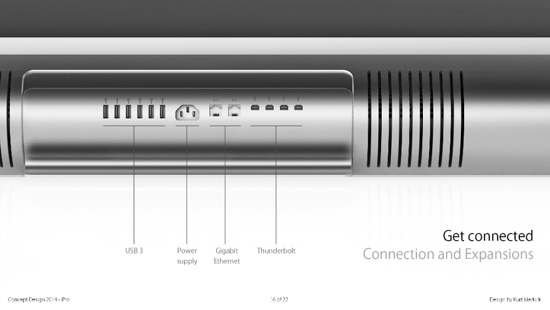 Компьютер оснащается OLED-монитором диагональю 35 дюймов, толщина его составляет всего 8 мм. Внешне он напоминает огромную клавиатуру Apple, в которую внедрили экран: компьютер стоит на своеобразной тубе, расположенной в основании монитора. На корпусе можно обнаружить 8 портов USB, 4 порта Thunderbolt 2. В целом, концепт выглядит достойно, но стоит ли выпускать Apple что-то подобное?