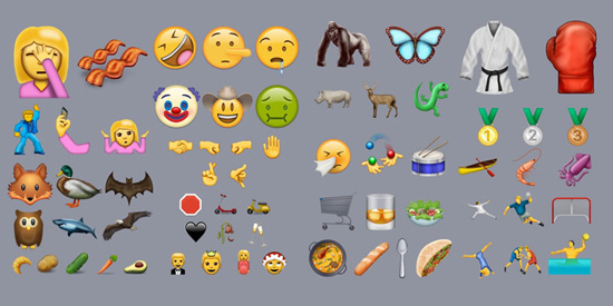 Среди новых эмодзи есть по 7 новых изображений людей, лиц (клоуны с различной мимикой), 14 изображений растений и животных (картошка, горилла, носорог, олень и прочие), 18 символов еды (киви, авокадо, салат, огурец, морковь и др.), блюда, добавлены новые смайлики на спортивную тему, а также изображения новых эмоций и жестов, среди которых фейспалм, пожимающий плечами и катающийся по полу от смеха смайлик (ROFL).