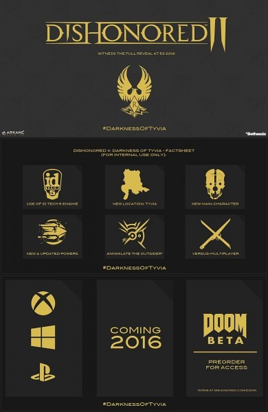 Недавно издатель опубликовали приглашение на первую собственную пресс-конференцию на выставке E3 2015. На изображении представлены места, зарезервированные для персонажей из различных игр издателя. И среди них присутствует Толлбой, элитный охранник из Dishonored. Все это дает основания предположиться, что анонс Dishonored 2: Darkness of Tyvia состоится на крупнейшей выставке в середине июня.