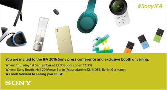 С приближением выставки IFA все ценители электроники все в большей степени ощущают предвкушение новых интересных анонсов. На этот раз в Берлине в ходе замечательного ежегодного мероприятия состоится презентация Sony. Компания пригласила на свою презентацию, которая начнется 1 сентября 2016 года в 13:00 в павильоне Sony в Мессе Берлин. Похоже, что на этой презентации будут показаны новые устройства для потребителей.
