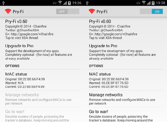 Известный хакер Chainfire разработал утилиту под Android, которая должна существенно затруднить слежку через WiFi. Программа Pry-Fi изменяет стандартное поведение Android и блокирует трансляцию в эфир списка известных хотспотов. При этом программа по-прежнему допускает сканирование и автоматическое подключение к известным хотспотам. В промежутке между подключениями Pry-Fi случайным образом меняет MAC-адрес устройства, медленно, но верно засоряя базу данных наблюдателя. Есть специальный «военный» режим (“War!”), предназначенный для максимального засорения базы в тех местах, где наблюдение точно ведется.