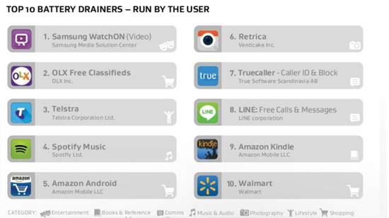 Из «пожирателей батареи», которых пользователь запускает самостоятельно, стоит выделить действительно популярные музыкальный сервис Spotify (4 место), фотоприложение Retrica (6 место), месседжер Line (8 место) и «читалку» Amazon Kindle (9 место).