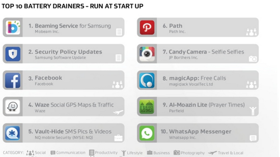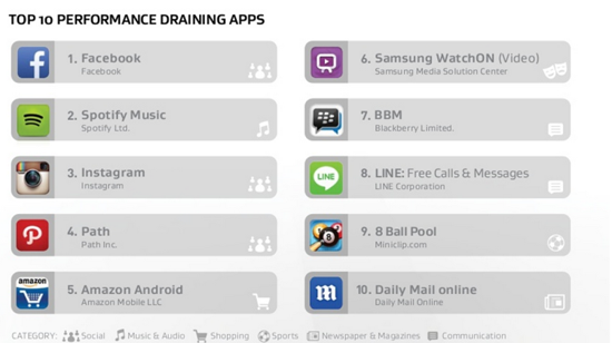 Исходя из этого отчёта, одним из самых «вредных» приложений является клиент социальной сети Facebook, который занимает третье место в категории «пожирателей батареи» среди приложений, запускающихся с включением смартфона, третье место среди «поглотителей свободного места» на внутреннем хранилище, третье место среди «проглотов трафика» и первое место среди приложений, пожирающих ресурсы производительности. При всём этом Facebook занимает первое место среди установленных приложений из категории Социальные.