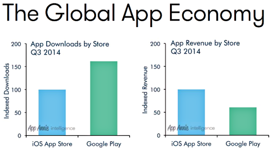 Несмотря на превосходство по чистому количеству скачанных приложений, экосистема Android значительно проигрывает iOS по объёмам доходов, генерируемых за счёт этих самых приложений. Об этом пишет MacDailyNews, ссылаясь на данные отчёта «Emerging Markets and Growth in the Global App Economy», составленного совместно аналитической компанией App Annie и ассоциацией MEF.