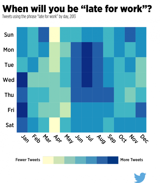 Сервис микроблогов Twitter проанализировал твиты своих пользователей в зависимости от дня недели и месяца. Полученные результаты компания представила в виде инфографики. При анализе учитывалось количество твитов в миллионах.