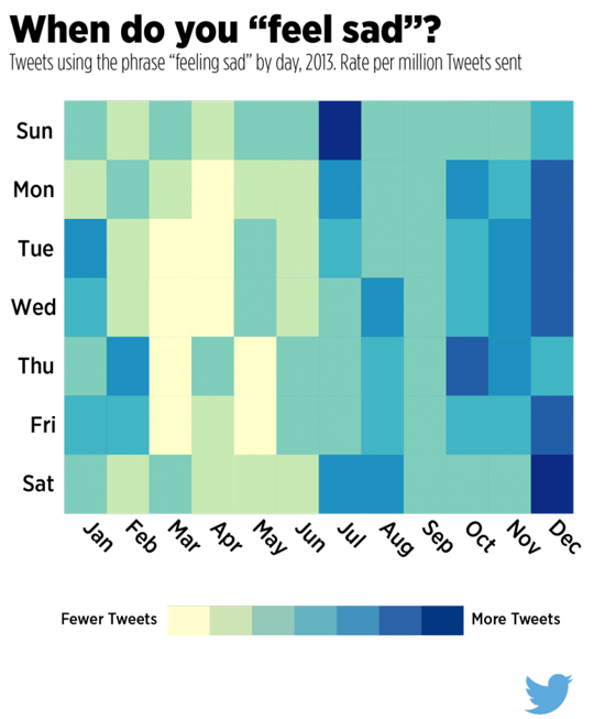 Оказалось, что самые грустные твиты пользователи публикуют по воскресеньям в июле и по субботам в декабре.