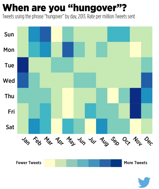Самыми похмельными днями в 2013 году оказались всё те же новогодние праздники в январе и (почему-то) конец рабочей недели в ноябре.