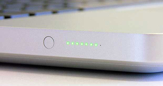 Когда-то в Мак-ноутбуках был встроенный индикатор, позволяющий увидеть заряд аккумулятора, если даже компьютер был выключен. У батареи была специальная кнопка и несколько светодиодов, а нажатие на кнопку показывало уровень оставшегося заряда. Сами аккумуляторы, кстати, были сменными, и если, например, они умирали, то их легко можно было самому заменить на новые и продолжить пользоваться компьютером.