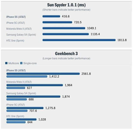 Обозреватели отмечают, что А7 — это, похоже, один из самых быстрых мобильных процессоров. Несмотря на два ядра, чип в ряде задач опережает 4-ядерный Snapdragon 800. «Основываясь на всех бенчмарках, которые удалось найти, можно говорить, что iPhone 5S и его новый процессор A7 по крайней мере в два раза производительнее iPhone 5 и установленного в нём чипа A6», — отмечают сотрудники CNET.
