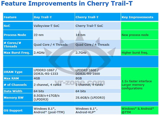 Платформа для планшетных компьютеров Cherry Trail-T будет включать новую 14-нм систему-на-чипе Cherryview, основывающуюся на ядрах Airmont. Графическая часть этих процессоров будет переведена на существенно улучшенное восьмое поколение архитектуры, которое параллельно найдёт применение и в перспективных процессорах Broadwell.