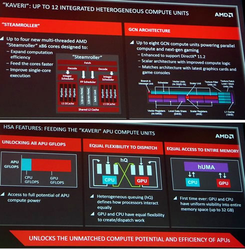 По словам представителя компании AMD, процессоры Kaveri могут включать в себя до четырех ядер CPU и восьми ядер GPU, а производительность мощнейшей модели A10-7850 будет достигать 856 гигафлопс и превосходить показатели аналога в модельном ряду Intel Haswell. Его номинальная частота составит 3,7 ГГц, а также он получит два модуля на базе архитектуры Steamroller, что позволит выполнять сразу 4 потока одновременно.