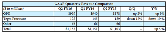Между тем, доход от продажи ускорителей Tesla снизился до $62 миллионов, а Quadro — до $187 миллионов. Последнее объясняется слабеющим рынком рабочих станций. Но в случае с Tesla компания ожидает улучшений, поскольку популярность GPGPU в крупных ЦОД возрастает. Продажи мобильных процессоров Tegra за прошедший квартал сократились на 12 %, до $128 миллионов, но в случае с чипами для автомобильных приложений, наоборот, наблюдается рост до $71 миллиона, что на 76 % больше прошлогоднего показателя. Общая сумма доходов NVIDIA составила $1,153 миллиарда. Это на 5 % выше показателя прошлого года, но в сравнении с предыдущим кварталом ($1,151 миллиард) прирост незначителен. Валовая прибыль сократилась до 55 %, но всё равно остаётся рекордной среди компаний, не обладающих собственными производственными мощностями (fabless).