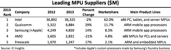 Рынок микропроцессоров, объём которого в 2013 году составил $58,6 млрд, является самым крупным сегментом полупроводниковой индустрии и занимает в ней 22-процентную долю. Среди MPU большая часть продаж (69 %) приходится на чипы, используемые в серверах, ПК и встраиваемых решениях. На долю планшетных микросхем приходится 6 % продаж MPU против 4 % годом ранее. Процессоры приложений, предназначенные для мобильных телефонов, контролируют здесь 25% продаж.