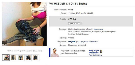 21-летний Ли Пэйн разместил объявление с продажей двигателя на аукционе eBay, при этом на картинке кроме самого продаваемого предмета красовалась пышная грудь его подруги в красном бюстгальтере.