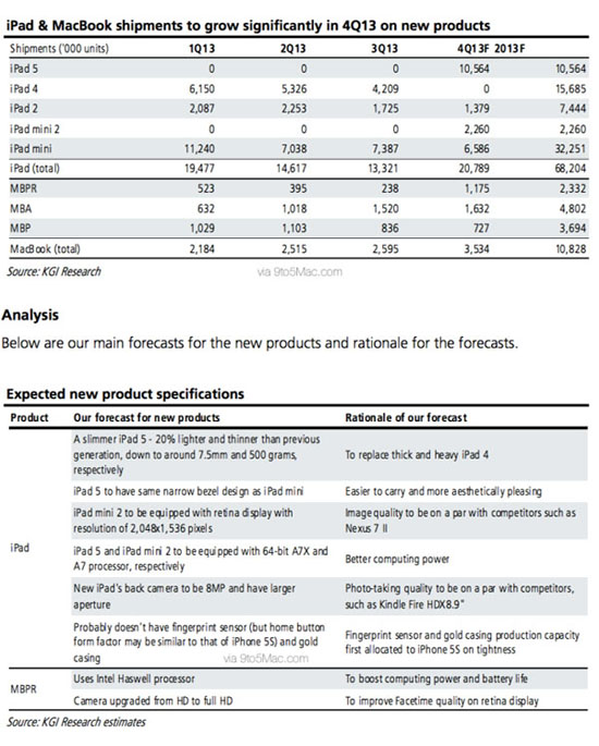 Давно знакомый нам аналитик из KGI Мин-Чи Куо опубликовал отчет со своими прогнозами на презентацию Apple, которая пройдет 22 октября. Во-первых, гвоздем программы будут iPad. Более легкий iPad 5 будет хедлайнером мероприятия. Куо считает, что пятое поколение полноразмерного планшета будет на 20% легче, его толщина составит 7.5 мм, а вес будет примерно 500 гр. Конечно, в этом уже никто не сомневается, у него будут более тонкие рамки.