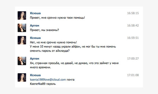 Незнакомец под видом «Ксюши» и аватаркой модели Дианы Мелисон написал Куликову, попросив его сменить пароль от iCloud. Логика мошенников, как отмечает Meduza, состоит в том, чтобы заставить человека переключить аккаунт в iPhone или iPad на предоставленный. Сразу после этого гаджет дистанционно блокируется, после чего у жертвы требуют выкуп.