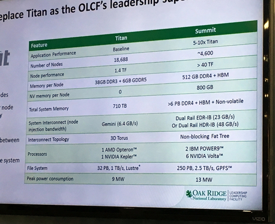 Лаборатория в Ок-Ридже опубликовала слайд, на котором Summit сравнивается с суперкомпьютером Titan, базирующимся на чипах Kepler GK110. Состоит он из 18688 узлов, мощность каждого из них составляет 1,4 терафлопса. На том же плакате указаны спецификации Summit: 4600 узлов с мощностью более 40 терафлопс на узел. Указано также, что в каждом узле будет 512 Гбайт памяти DDR4, 800 Гбайт энергонезависимой памяти и некий объём памяти HBM (речь, разумеется, идёт о HBM2). Основой каждого узла станут пара процессоров IBM POWER9 и шесть процессоров NVIDIA Volta. Чипы POWER9, помимо традиционных линий PCI Express (версия 4.0) имеют и 48 линий интерфейса Bluelink, который будет работать в режиме NVLink 2.0 и соединять их с процессорами Volta, что позволит процессорам различных архитектур делить общее пространство памяти, практически не теряя в скорости: пропускная способность может составлять от 80 до 200 Гбайт/с.