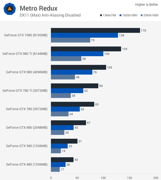 Так GTX 1080 способна выдавать на 20-50 кадров в секунду больше, чем GTX 980 Ti на разрешении в 1366х768. Разница на разрешении FullHD немного ниже — карта с новой архитектурой Maxwell показывает на 10-40 кадров в секунду быстрее предшественника с архитектурой Pascal. А на разрешении 2560х1600 разница уменьшается до 20-30 кадров в секунду. При этом работу всех видеокарт сравнивали на DirectX 11, в то время как пользователи DirectX 12 должны получить еще большее преимущество.
