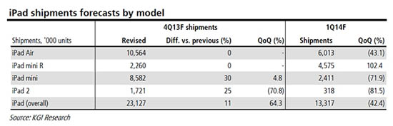 Постепенно повышая уровень производства, к началу первой четверти 2014 года объемы поставок iPad mini Retina возрастут на 102%. Такой рост будет достигнут за счет праздничного сезона, который, в свою очередь, снизит количество iPad Air до 6 млн единиц.