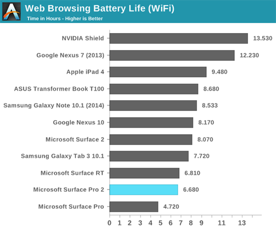 Как выяснил Ананд Лал Шимпи с AnandTech, время автономной Surface Pro 2 в режиме просмотра веб-страниц через соединение Wi-Fi составляет 6,68 часа. Это на 41,5% лучше показателя Surface Pro, который в тех же условиях продержался 4,72 часа. Но iPad 4 и Google Nexus 7 проработали дольше — на 29,5% и 45,3% соответственно.
