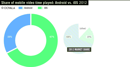 Так, среди владельцев гаджетов с операционной системой веб-видео смотрят чуть более трети человек (33%). Среди обладателей смартфонов Apple эта цифра составляет 67%. Однако аналитики Ooyala прогнозируют, что этот разрыв со временем может сократиться. Об этом говорит диаграмма справа, которая показывает поставки гаджетов за прошлый год. Android просто вытесняет iPhone в узкую нишу.