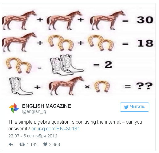Ответы интернет-пользователей разнятся, причем довольно существенно. Если вычислить, какому числу соответствуют лошадь, подкова и сапог, могут практически все, то решить четвертое уравнение под силу далеко не каждому.