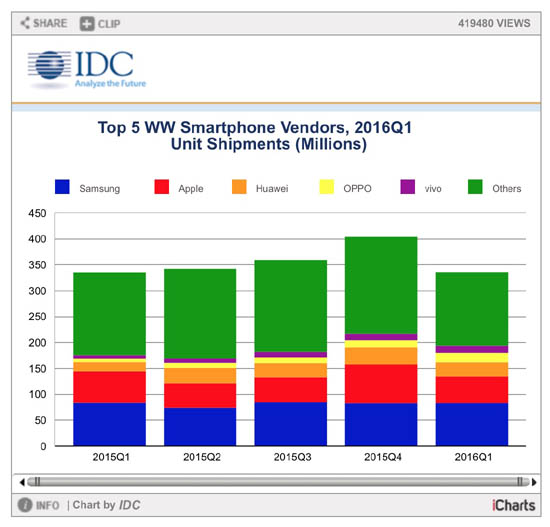 Да, Samsung действительно продает больше смартфонов, чем Apple. Но по флагманским моделям и своему ценовому сегменту в Купертино по-прежнему на голову обходят конкурентов. В своем «провальном», по словам аналитиков, квартале Apple продала 51 миллион iPhone со средней ценой 650 долларов. Результат Samsung Galaxy S7 оказался на уровне 10 миллионов устройств, и это при годовом росте 25 %.