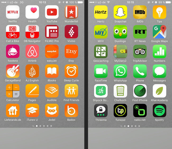 Как можно видеть по скриншотам, он полностью отказался от папок и распределил все ярлыки по цветам. Дело в том, что мы не всегда можем знать местоположение нужного ярлыка, но совершенно точно помним, как он выглядит. Таким образом, при перелистывании экранов нужное приложение можно найти буквально за одно мгновение.