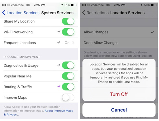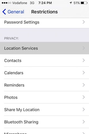 Далее нажми Включить ограничения — так ты активируешь все позиции этого меню. Прокрути вниз, отыщи Службы геолокации и кликни по этому пункту.