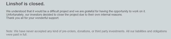 Увы, но достоверно узнать, планировали ли в Linshof представить прототип i8 и Performance Tablet, или же задуманное изначально имело сугубо мошеннические цели, теперь не выйдет. Linshof официально объявила о закрытии проекта, о чём гласит информация на сайте компании. Причиной такого шага стал, по словам руководства немецкой фирмы, отказ инвесторов от сотрудничества и финансовой помощи для производства и последующего запуска мобильных устройств на рынок.