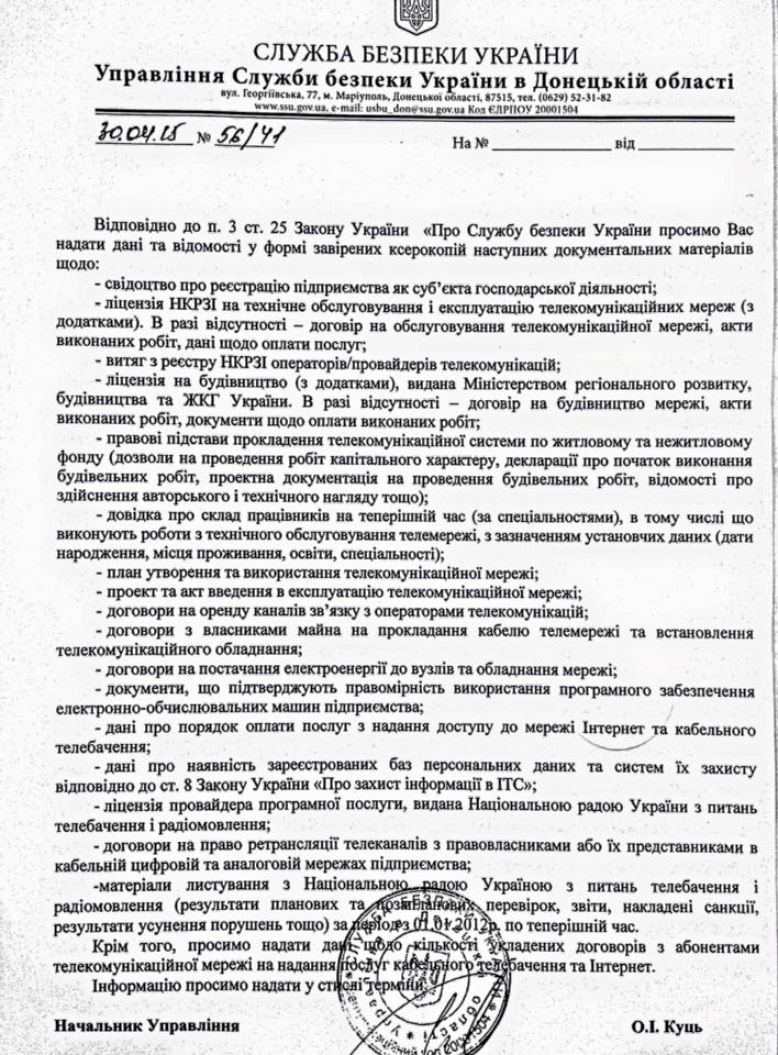 Как стало известно InternetUA, Служба безопасности Украины решила собрать детальную информацию о работающих в Донецкой области провайдерах. В Facebook попала следующая копия запроса Управления СБУ в Донецкой области.