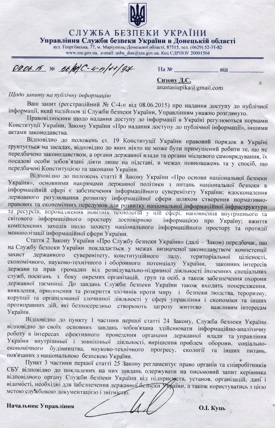 Мы направили официальный запрос в центральное управление СБУ, в котором попросили объяснить, почему их региональный орган собирает такую информацию. Однако получили ответ, подписанный главой СБУ в Донецкой области Александром Куцем.