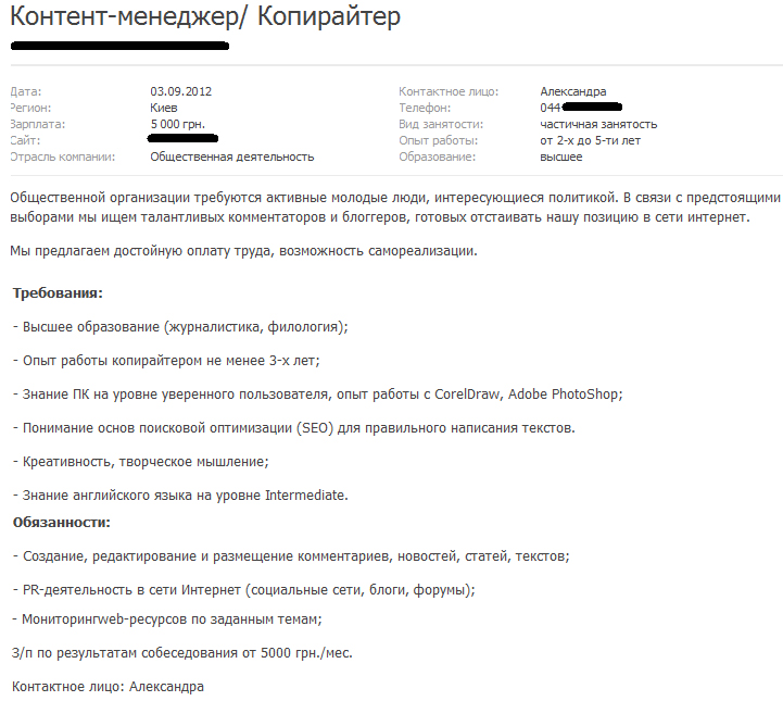 Вакансии по набору web-троллей, прикрывающих тыл президентского табора, здесь представлены хоть и не так массово, как оппозиционные, но всё же – в достойном количестве. Как и положено, «непыльная работа» проплаченного брызгослюна искусно маскируется под должности копирайтеров и журналистов. Работодатель, по традиции, представляется «издательским домом», «общественной организацией» или «рекламным агентством».