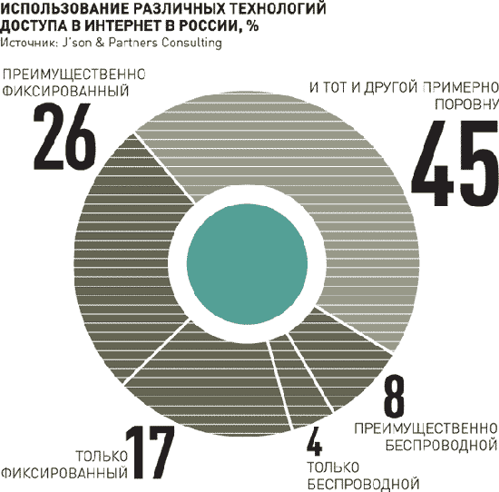 По данным компании, сейчас среди всей российской интернет-аудитории 83% когда-либо пользовались беспроводным доступом в Интернет, 8% используют беспроводной интернет-доступ чаще, чем фиксированный, а 4% пользуются только беспроводным доступом. Проникновение мобильного интернет-доступа в России приблизительно в 2 раза превышает аналогичный показатель в среднем в мире, при этом уступает ряду стран Западной Европы, США, Японии и Южной Кореи. К концу 2012 года суммарная российская абонентская база передачи данных с мобильных устройств достигла 65,5 млн активных абонентов, а активная абонентская база пользователей мобильного Интернета на USB-модемах составила около 11,9 млн. При этом суммарная аудитория мобильного интернет-доступа составляет около 40 млн.