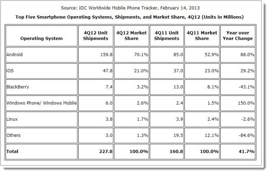 «Доминирование Android и Apple, — говорится в докладе IDC. — достигло нового рубежа в четвертом квартале 2012. Доступность «андроидных» смартфонов на любой вкус и кошелек была вознаграждена неудержимым ростом».