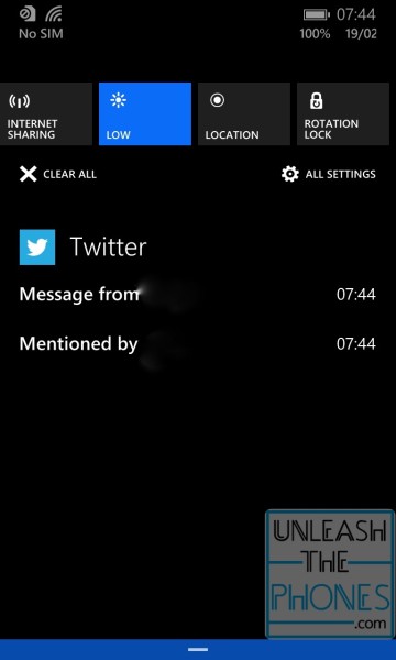 В Microsoft решили быть оригинальными и назвали свой центр уведомлений Action Center, хотя по идеологии он не отличается от аналога в Android. Он представляет из себя выдвигающуюся сверху «шторку», в верхней части которой расположено четыре выключателя, связанных с функциями системы. Эти элементы можно настраивать в отдельном меню, посвященном Action Center, выбор велик — от активации Wi-Fi до блокировки смены ориентации и запуска камеры. На этом же экране отображаются все установленные в системе приложения (Иконка+Имя), имеющие возможность публиковать уведомления. Простым нажатием на их имена открываются дополнительные настройки. У каждого из них можно задать свой звук нового сообщения, отображение стандартного баннера (который имеется в системе сейчас), а также полностью отключить уведомления от данной программы.