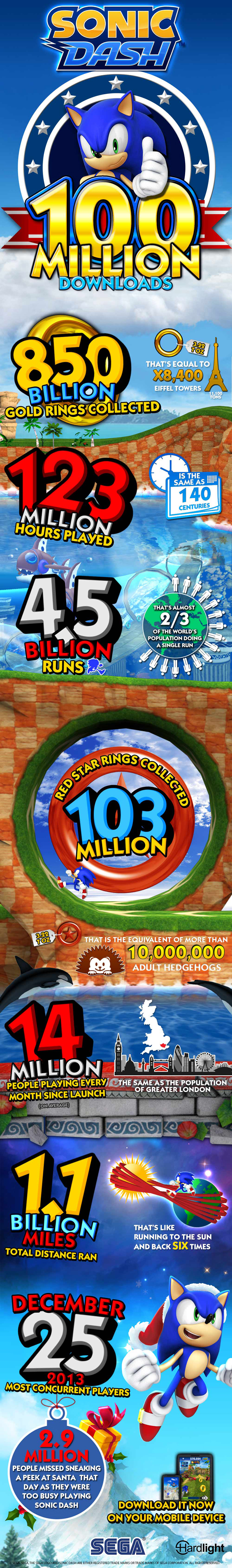 Было время, когда игры про ежа Соника пользовались необычайным успехом на консолях, но сейчас эта серия нашла новое пристанище на мобильных устройствах. Согласно отчёту компании Sega, мобильный раннер Sonic Dash, выпущенный в марте 2013 года, преодолел отметку в 100 миллионов загрузок в App Store, Google Play, Amazon App Store и Windows Phone Store, что делает эту игру самым популярным мобильным проектом по вселенной Соника. В честь этого события Sega выпустила инфографику, на которой представлены все достижения геймеров с момента релиза игры.