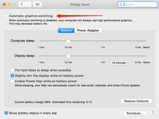 Некоторые виновники были выявлены: это Java и Flash, а вот в играх и любых приложениях, серьёзно нагружающих графический процессор, GPU по-прежнему переключается нормально. Официального решения проблемы пока нет, ресурс MacNN предлагает свой метод, грубый, но действенный. Заключается он в запрете на переключение графических ядер и постоянном использовании одного из них: Intel HD для тех, кому важно время работы от батарей, либо NVIDIA для пользователей, постоянно пользующихся тяжёлыми 3D-приложениями. В первом случае помочь может утилита gfxCardStatus, а во втором — отключение автоматического переключения в Energy Saver. В любом случае, такие решения далеки от оптимального, поэтому придётся ждать выпуска соответствующей официальной «заплатки» Apple.