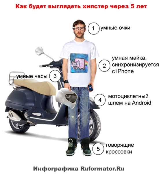 Хипстеры любят гаджеты, модную одежду, постить луки, гонять на скутерах и слушать инди. Носимые устройства – это 100% хипстерский продукт. Возможно, уже через пару лет мы увидим на улицах молодых людей в «умных» гуглоочках, с умными часами на запястье и в майках, которые умеют постить луки в Instagram. Чтобы было удобнее гонять на скутерах, хипстеры будут носить шлемы с элементами дополненной реальности.
