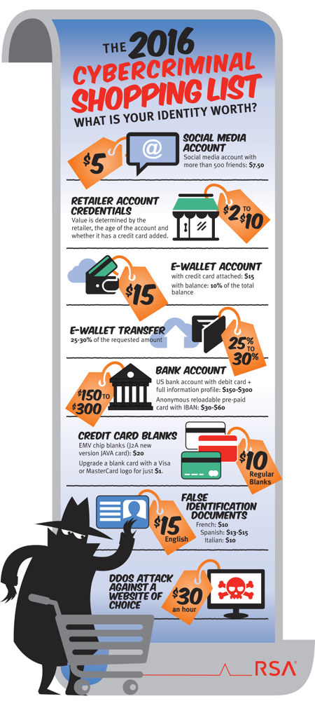 Наконец, специалисты RSA также выяснили, сколько стоит купить на черном рынке идентификационные документы. Если этот документ на французском языке, стоимость составит $10, на испанском — $13-15, на итальянском — $10, на английском — $15. В компании не уточнили, о каких именно типах документов идет речь.