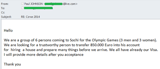 Наконец, не обошлось и без традиционного в таких случаях «нигерийского спама». Представляясь группой туристов, которые хотели бы посетить олимпийский Сочи, мошенники просили получателей писем посодействовать в переводе крупной суммы денег якобы для бронирования гостиниц и всех необходимых приготовлений перед поездкой. Детали они готовы были сообщить после обратного ответа, в котором пользователь выразил бы свою заинтересованность.