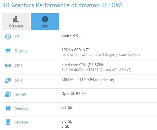 GFXBench сообщает, что новый планшет работает под управлением Android 5.1 Lollipop, что, видимо, означает наличие у новинки Amazon Fire OS 5 на борту.