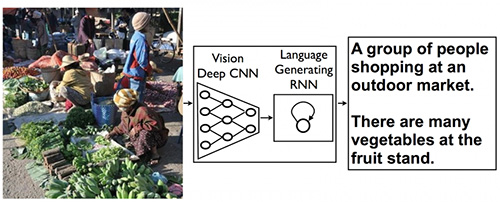 «Я бы назвала пиксельные данные в изображениях и видео темным веществом Интернета, и мы начинаем освещать его», — заявляет Фэйфэй Ли (Fei-Fei Li), директор Лаборатории искусственного интеллекта Стэнфордского университета. Вместе с аспирантом Андреем Карпатым, соавтором доклада «Deep Visual-Semantic Alignments for Generating Image Descriptions», она работает над Multimodal Recurrent Neural Architecture, системой аннотирования картинок на естественном языке, создающей семантическую связь с визуальным контентом веб-страниц.