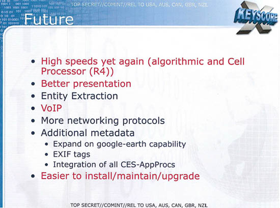 Система XKeyscore позволяет также осуществлять ретроспективный поиск в записанном архиве трафика и метаданных. Например, вывести все пользовательские сессии, в которых пользователь искал на Google Maps определенные координаты. Метаданные пользовательских сессий обычно хранятся в течение 30-ти дней. Собранная информация доступна четырем странам-партнерам США: это Великобритания, Австралия, Канада и Новая Зеландия.