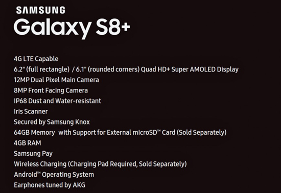 Итак, по данным источника, Samsung Galaxy S8 Plus оснащается 6,2-дюймовым Super AMOLED-дисплеем со скругленными на бока кромками с разрешением Quad HD (2560 x 1440 пикселей), 8-мегапиксельной фронтальной камерой и 12-мегапиксельной основной камерой с технологией Dual Pixel, 4 ГБ оперативной и 64 ГБ встроенной флеш-памяти с поддержкой карточек microSD. Также отмечается сканер радужки глаз, защита от воды и пыли по стандарту IP68, поддержка 4G LTE, Samsung Pay и Samsung Knox, беспроводной зарядки, операционная система Android и наушники, настроенные AKG.